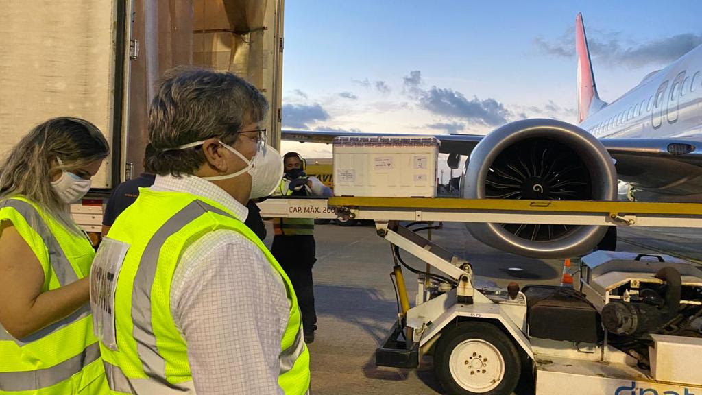O governador João Azevêdo esteve, nesta quinta-feira (1), no aeroporto Castro Pinto, onde acompanhou a chegada de 180.750 doses de vacina contra a Covid-19, sendo 167 mil do Instituto Butantan e 13.700 da Fiocruz. Esta é a 11ª remessa de vacinas que serão enviadas aos municípios nas primeiras horas da manhã desta sexta-feira (2), seguindo a mesma metodologia logística para que todas as regiões do estado estejam abastecidos com as vacinas antes do meio-dia.