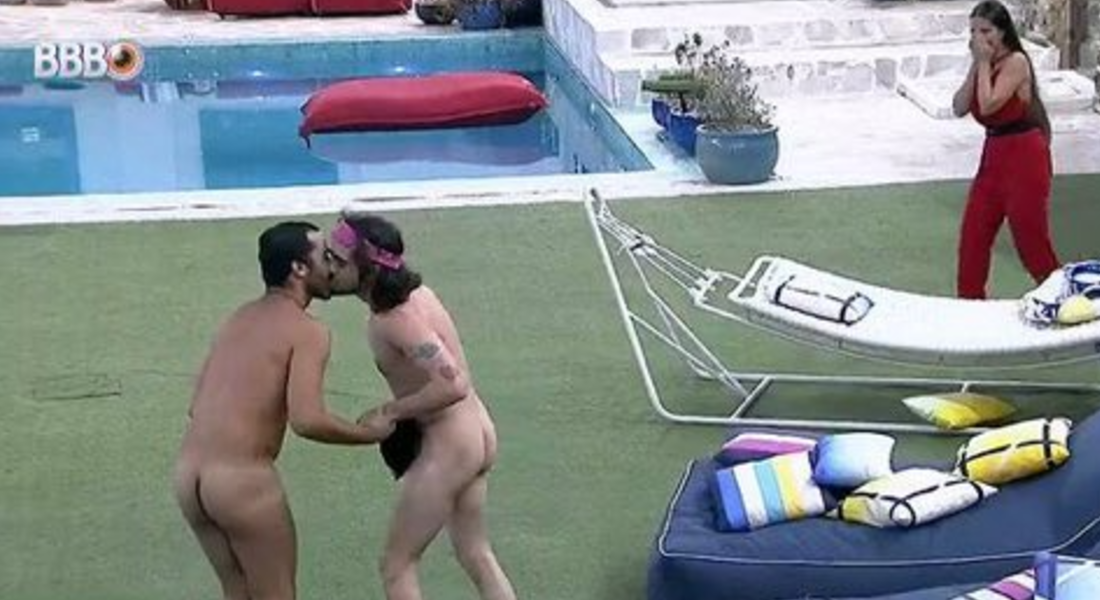 De mãos dadas, os brothers caminharam até perto da piscina, deram um selinho e correram para pular na piscina.