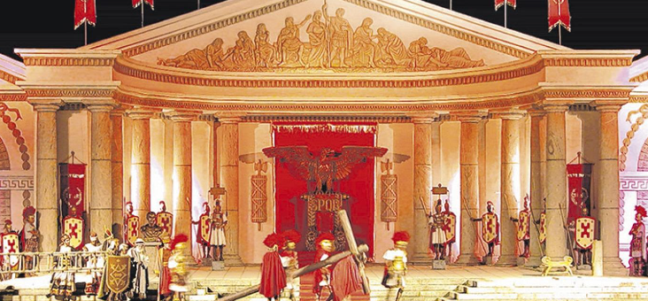 Na peça teatral, que este ano completa 54 anos de história, a vida de Jesus é contada em nove palcos-plateia com uma arrojada cenografia que reproduz lugarejos, ambientes e prédios da Jerusalém dos tempos de Cristo, como o Templo, Fórum Romano, o Palácio de Herodes e o Monte do Calvário.