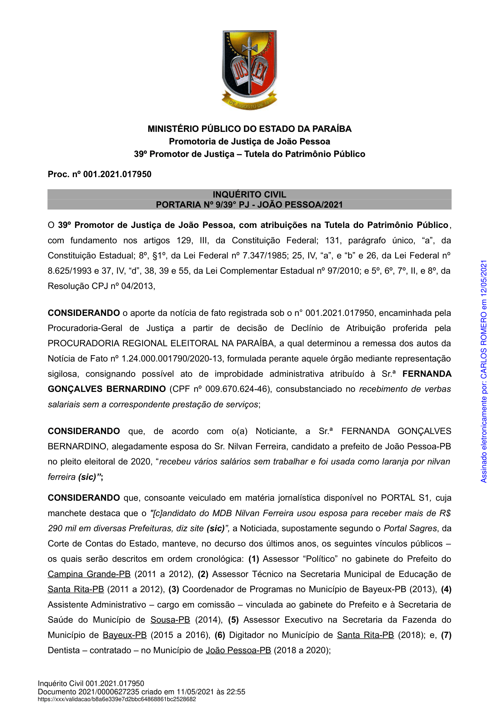 esposa do comunicador Nilvan Ferreira, Fernanda Gonçalves Bernardino, está sendo formalmente investigada pelo Ministério Público da Paraíba (MPPB) por suspostamente ser funcionária fantasma em diversas prefeituras paraibanas. A denúncia a colocou como “laranja” de Nilvan para o recebimento de vantagens.