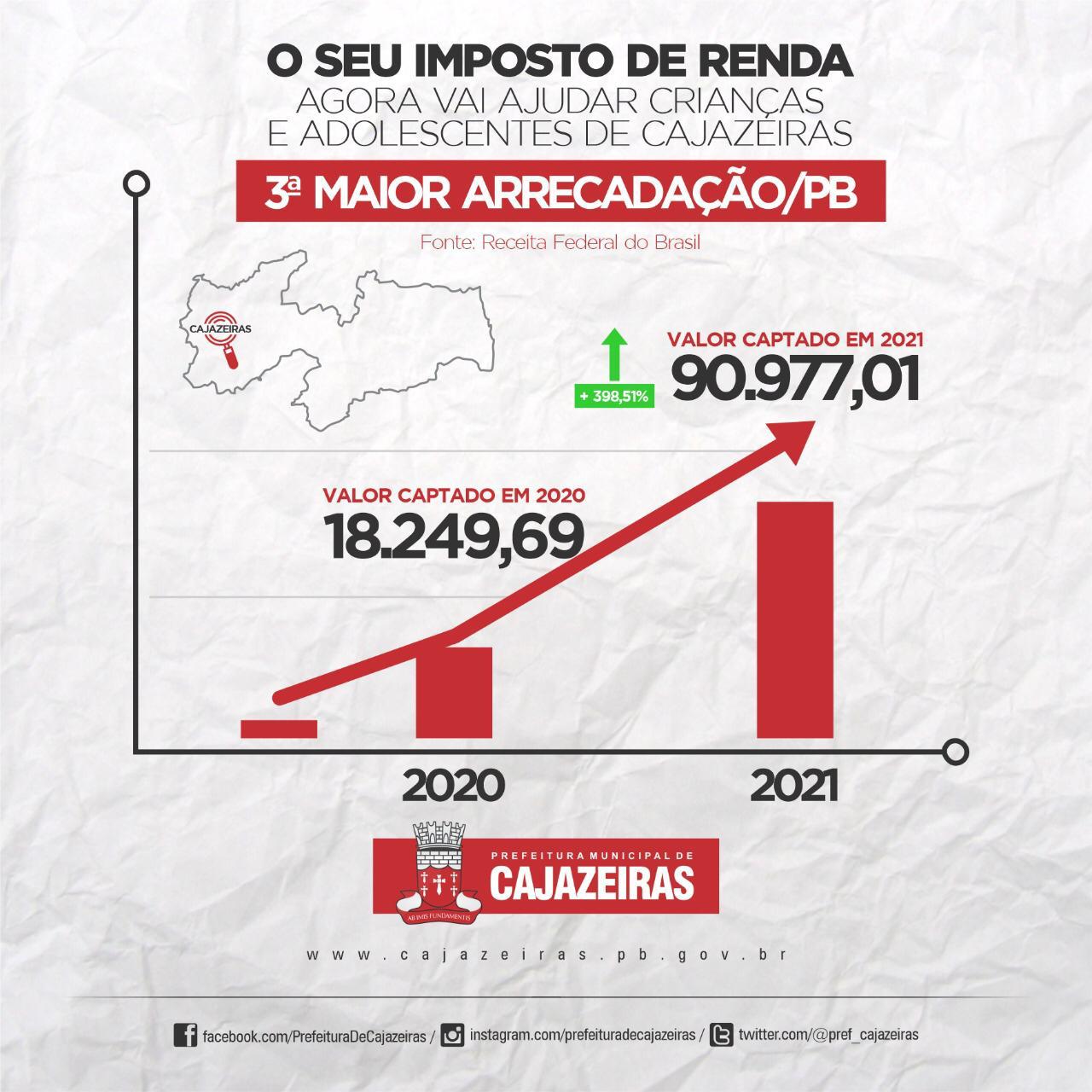 Por intermédio da Secretaria de Desenvolvimento Humano, a Prefeitura de Cajazeiras chamou o contribuinte para doar até 3% do seu Imposto de Renda para o Fundo Municipal dos Direitos da Criança e do Adolescente. O resultado foi um aumento de pouco mais de 18 mil reais arrecadados em 2020 para mais de 90 mil reais em 2021.