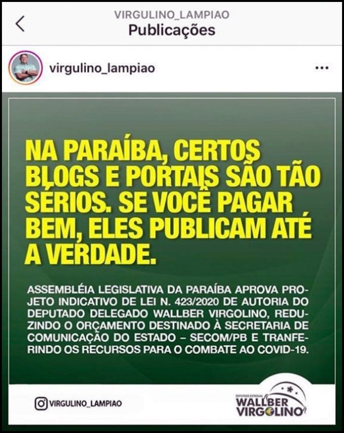 “Um grande disseminador das fake news na Paraíba é o deputado estadual Wallber Virgolino, que é delegado de polícia. Curiosamente, enquanto utiliza o WhatsApp para encorajar o povo a ir às ruas, ele refugiou-se com a família em um condomínio de luxo na cidade de Bananeiras (PB) e permanece em quarentena restrita”, diz trecho de reportagem veiculada pelo site Pragmatismo Político.