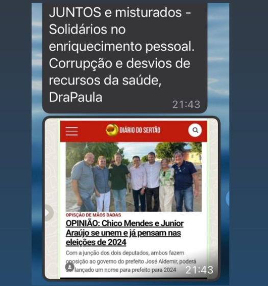 Conforme apurado pelo portal, a postagem de Doutora Paula foi em cima de uma matéria do portal Diário do Sertão, que fala sobre uma união entre Chico Mendes e Júnior Araújo, com vistas às eleições de 2024.