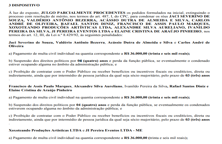 Uma decisão do juiz Guilherme Castro Lôpo, da 8ª Vara da Justiça Federal na Paraíba, condenou por improbidade administrativa o deputado estadual paraibano e ex-prefeito da cidade de São Bento, Jaci Severino de Souza (Galego Souza), duas empresas e mais 9 pessoas.