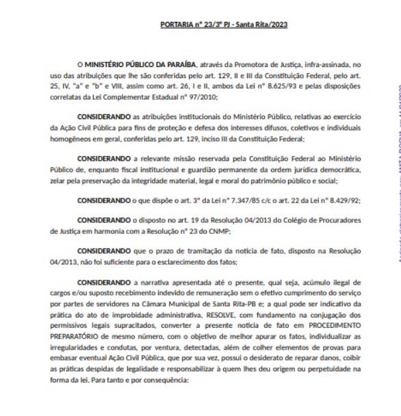 O Ministério Público da Paraíba, por meio da Promotoria de Justiça de Santa Rita, abriu um procedimento preparatório para investigar acúmulo de cargos e funcionários fantasmas na Câmara Municipal de Santa Rita.