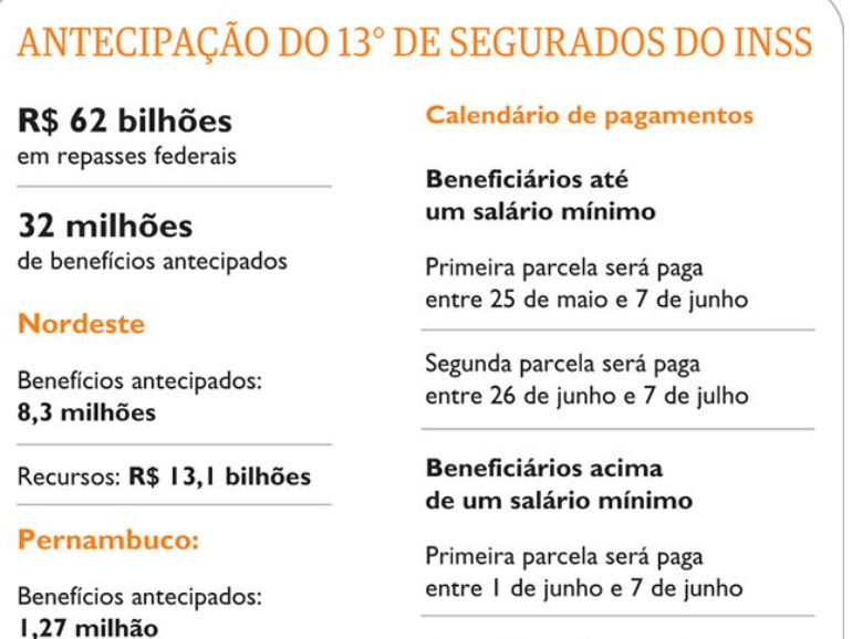 O Instituto Nacional do Seguro Social (INSS) decidiu antecipar, a partir de hoje (25), o pagamento do 13º salário para aposentados e pensionistas. Com a novidade, a estimativa é que sejam injetados R$ 2,14 bilhões em recursos federais somente na economia de Pernambuco.