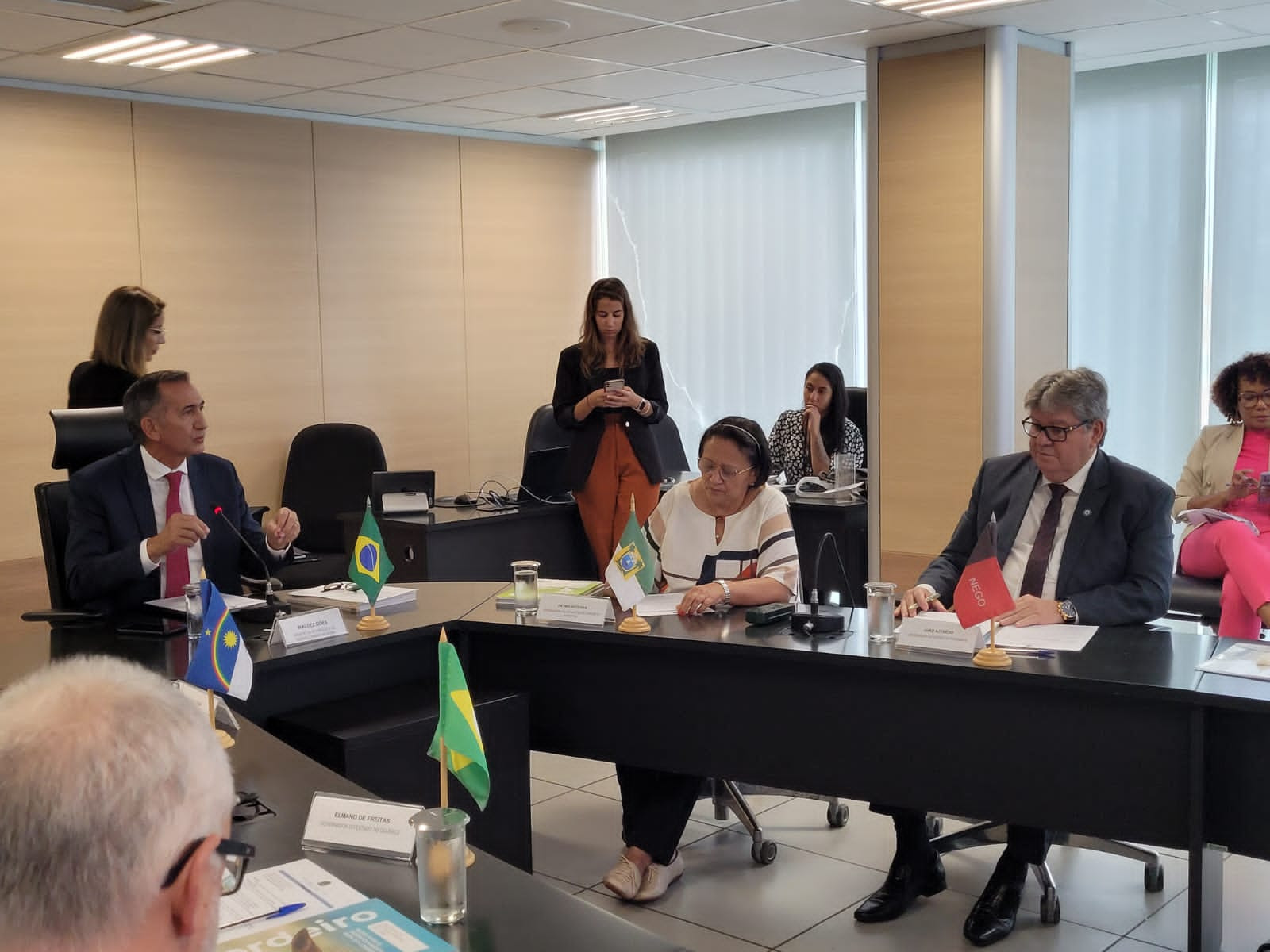 Os governadores Elmano de Freitas (Ceará), Fátima Bezerra (Rio Grande do Norte) e Raquel Lyra (Pernambuco), cujos estados também são beneficiados com as águas da transposição, participaram da reunião.