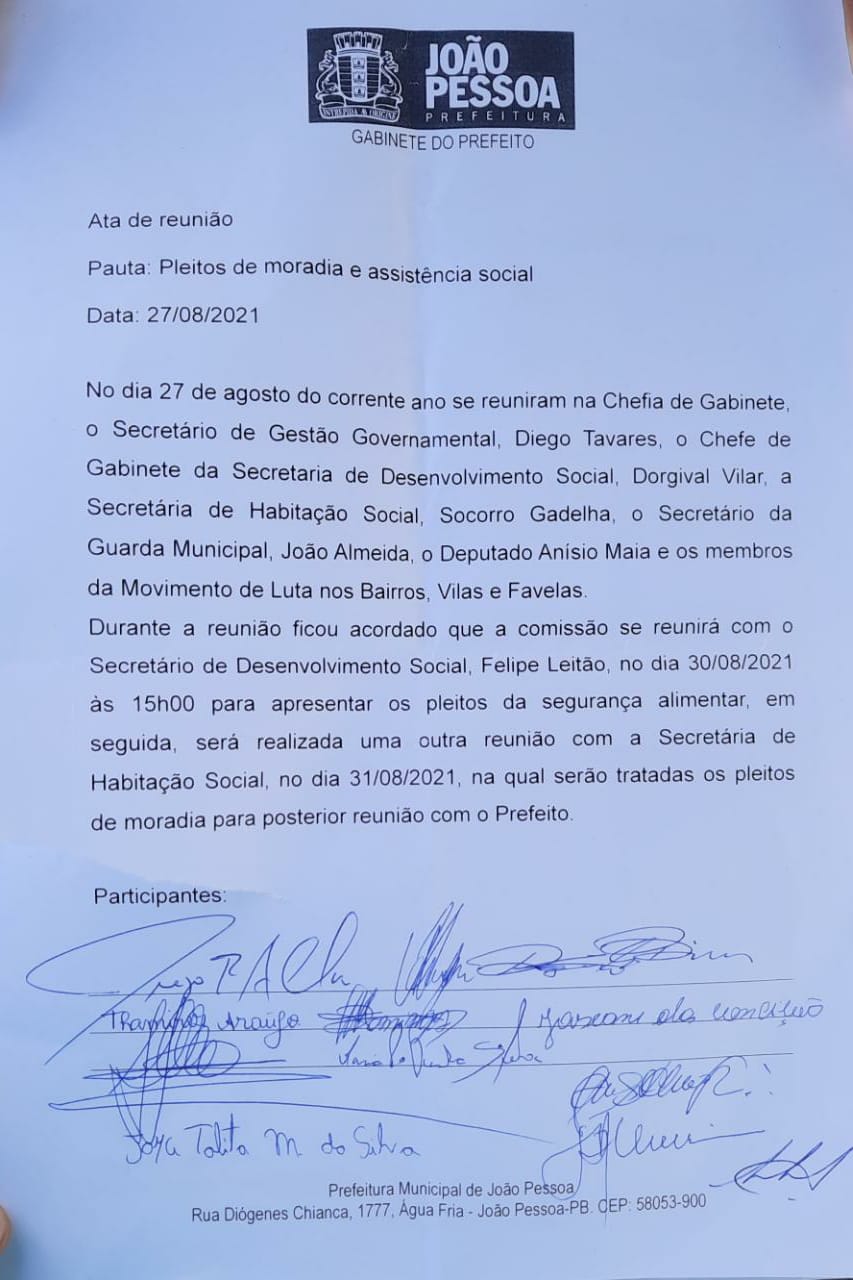 Após duas horas de reunião, ficou acordado (conforme ata produzida) que, na próxima segunda-feira (30), a comissão será recebida pelo secretário de Desenvolvimento Social Felipe Leitão para discutir a reivindicação de 400 cestas básicas para as famílias mapeadas pelo MLB em diversas comunidades de João Pessoa, e, no dia seguinte (31), para prosseguir o diálogo com a Secretaria de Habitação.