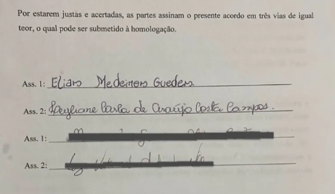 O contrato contém 6 cláusulas e define que a cliente deverá pagar a Elias um valor de R$ 5 mil (que foi borrado na imagem, mas ficou decifrável), dividido em três parcelas, a serem pagas nos dias 28 de fevereiro, no caso ontem, 28 de março e 28 de abril.