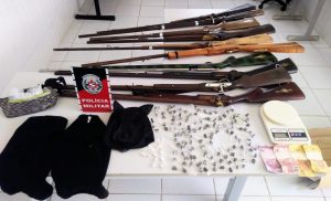 A Polícia Militar apreendeu 10 espingardas que estavam no quintal de uma casa, nessa segunda-feira (15), na cidade de Mari. A apreensão aconteceu quando policiais abordaram um suspeito de 15 anos, que tentou se esconder na residência. No local, foram encontradas também 129 trouxas de maconha prontas para a venda, seis embalagens com cocaína, 12 com crack, balança de precisão, toucas ninja, dinheiro e material para embalar drogas.