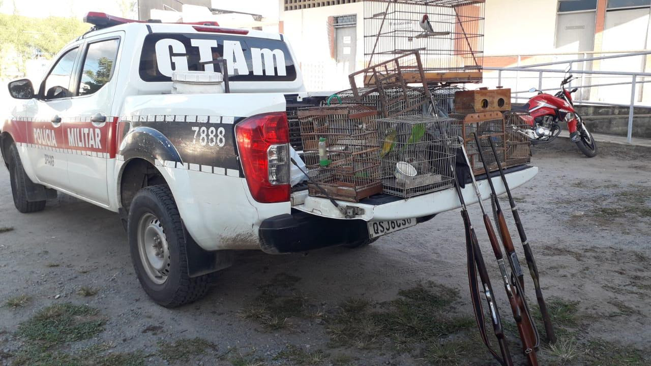 A Polícia Militar, por meio do Grupo Tático do Batalhão de Polícia Ambiental, apreendeu 13 aves silvestres mantidas em cativeiro, na cidade de Mulungu. Os policiais chegaram até o local através de denúncia, durante ação de proteção ao meio ambiente. Os animais estavam em uma casa, onde também foram apreendidas quatro armas de fogo que possivelmente seriam usadas em atividades de caça.