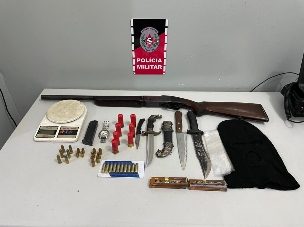 A Polícia Militar apreendeu uma espingarda, 34 munições de quatro calibres diferentes, facas e uma balança de precisão, nesta sexta-feira (13), em um barraco que estaria sendo usado como esconderijo de criminosos, na comunidade Maria Rita, na cidade de Lucena.