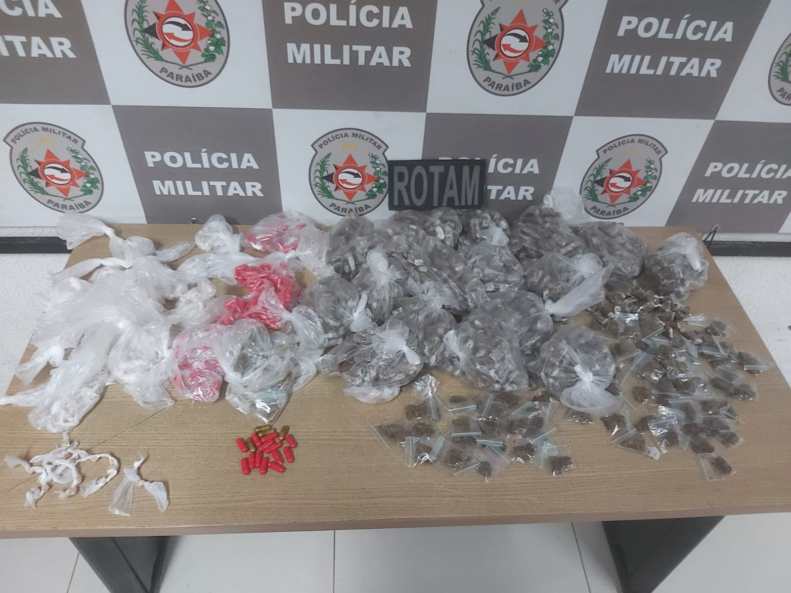 Equipes do Regimento de Operações Táticas com Apoio de Motocicletas (Rotam) apreenderam 1.212 trouxas de maconha, 340 pedras de crack e 317 cápsulas de cocaína, nessa quarta-feira (8), durante rondas na rua Vicente de Paulo Chianca, no bairro de Mangabeira, em João Pessoa. O entorpecente estava escondido em uma mata que tem na localidade e possivelmente foi abandonado por traficantes, ao perceberem a presença da Polícia Militar.