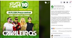 Apesar do aumento de casos do novo coronavírus nos últimos dias na Paraíba, o prefeito eleito do município de São João do Tigre, na região do Cariri paraibano, Márcio Leite (Republicanos) decidiu comemorar sua vitória, nas urnas, com um show em praça pública. Ele convidou a banda Cavaleiros do Forró para fazer sua apresentação neste sábado (21), às 22h, na praça central da cidade.