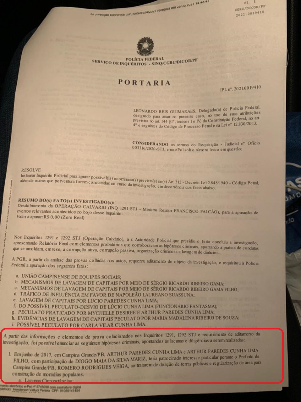 O presidente do inquérito é o delegado Leonardo Reis Guimarães e ele buscará esclarecer a doação de terrenos da prefeitura de Campina Grande e a regularização de área para construção de moradias populares para o conselheiro afastado do Tribunal de Contas do Estado da Paraíba (TCE-PB) Arthur Cunha Lima e Arthur Filho, que foi candidato deputado estadual em 2018.