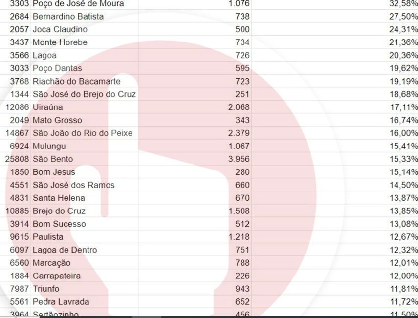O TCE também encontrou um percentual alto em Bernardino Batista, onde existem 2.684 pessoas acima de 15 anos e 738 delas (27,50%) estão matriculadas no EJA. Chama atenção, ainda, a cidade de Joca Claudino, com 2.057 pessoas nessa faixa etária e 500 matriculados, um percentual de 24,31%.