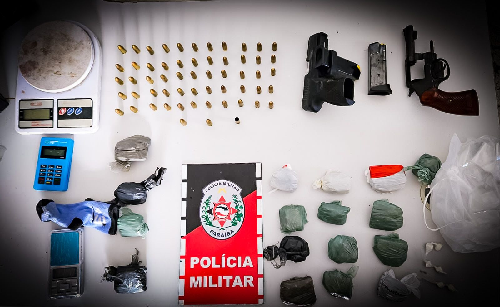 Com o homem foram encontrados uma pistola calibre 9mm, um revólver calibre 32, com 57 munições, além de materiais que comprovaram a existência do comércio ilegal de drogas, como: balanças de precisão, maquineta para cartão e uma quantidade considerável de maconha e crack.